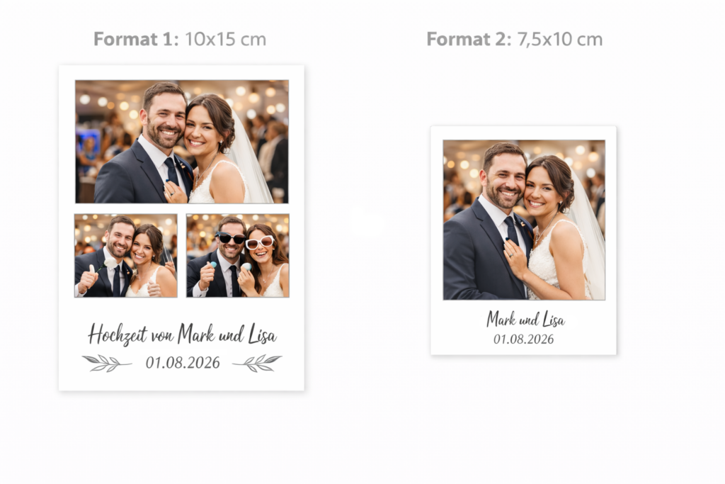 Das Druckformat wird einmalig vor der Veranstaltung festgelegt. 2 Druckrollen sind inklusive und reichen für die meisten Veranstaltungen. Der Preis enthält für Privatkunden 19% MwSt, für Geschäftskunden zzgl. 19% MwSt.